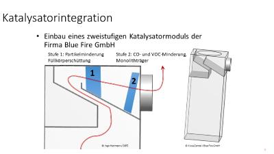 Um die Staubminderung integrierter Katalysatoren in Holzfeuerungen deutlich zu erhöhen, wurde ein von der Firma Blue Fire GmbH entwickeltes zweistufiges Katalysatormodul in einem einfachen und emissionsreichen Kaminofen des unteren Preissegmentes integriert und vom DBFZ Deutsches Biomasseforschungszentrum gemeinnützige GmbH unter simulierten Naturzugbedingungen getestet. Mit diesem zweistufigen Katalysatormodul konnten die Schadstoffe Kohlenstoffmonoxid (CO) um mehr als 80 %, Kohlenwasserstoffe (VOC) um 50 bis 70 % und Staub um mehr als 50 % gemindert werden.