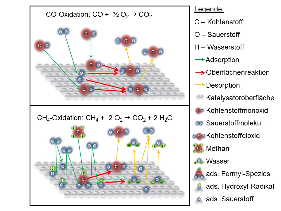 Durch den kurzzeitigen Kontakt zwischen Abgas und katalytischer Oberfläche kommt es zur Reduzierung der Aktivierungsenergie und die Emissionen CO- bzw. OGC sind wieder in der Lage, mit Sauerstoff zu reagieren. Es kommt zu der gewünschten Oxidation von CO zu CO2 bzw. von CnHm zu CO2 und kürzeren CnHm-Ketten.