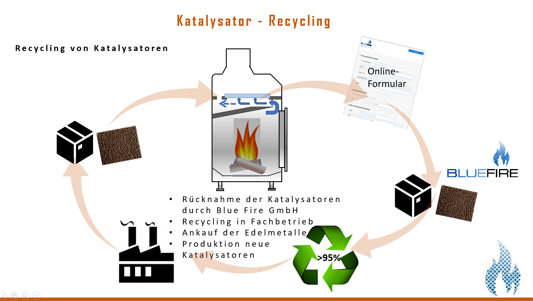 Emission Partner GmbH & Co. KG, die Muttergesellschaft der Blue Fire GmbH, hat bereits ein bundesweites Rückführungssystem für gebrauchte Katalysatoren eingeführt, das auf den Kundenstamm der Blue Fire GmbH ausgerollt werden soll.